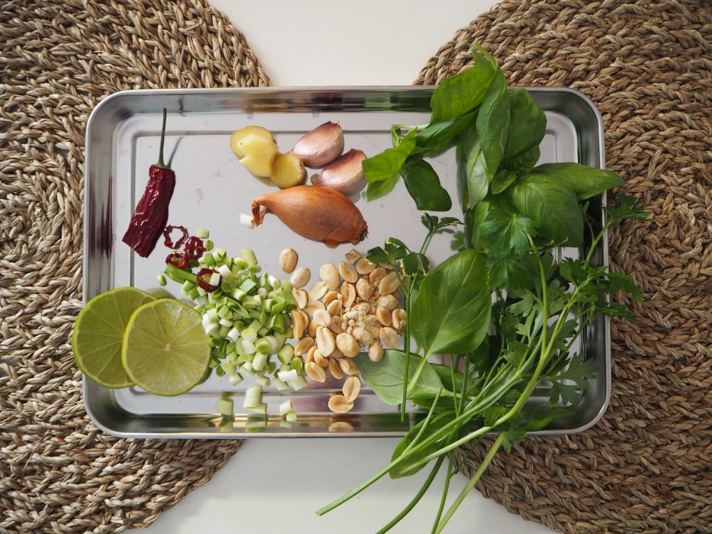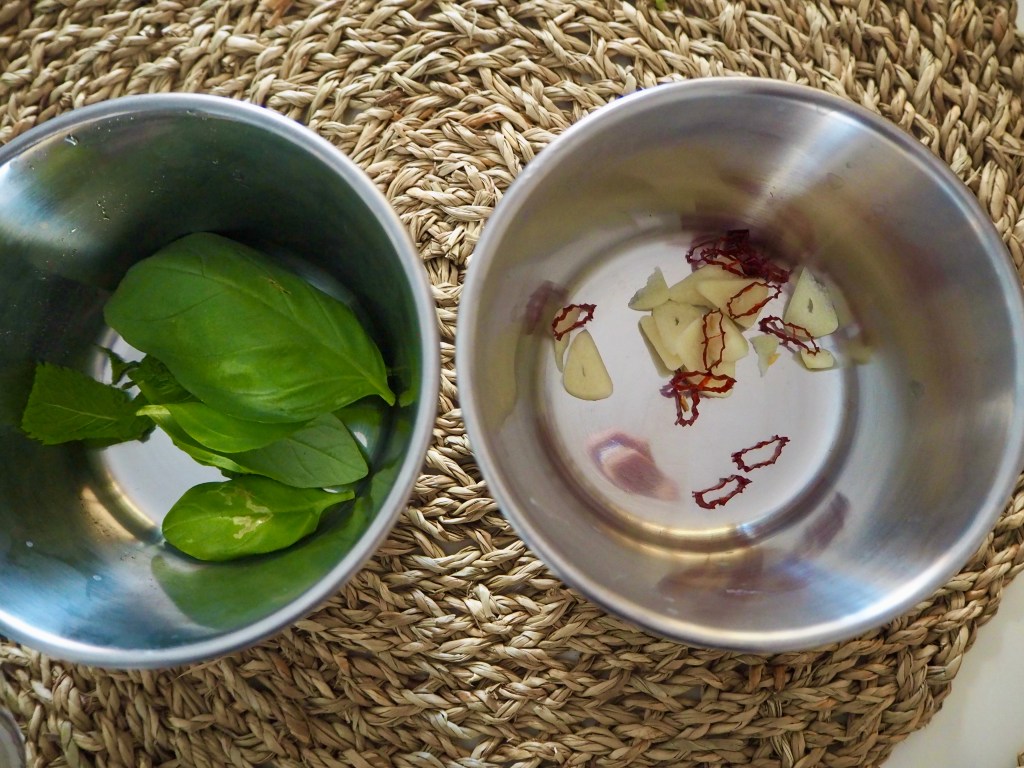1/2 dl lehtipersiljan ja (thai)basilikan lehtiä ohuina suikaleina