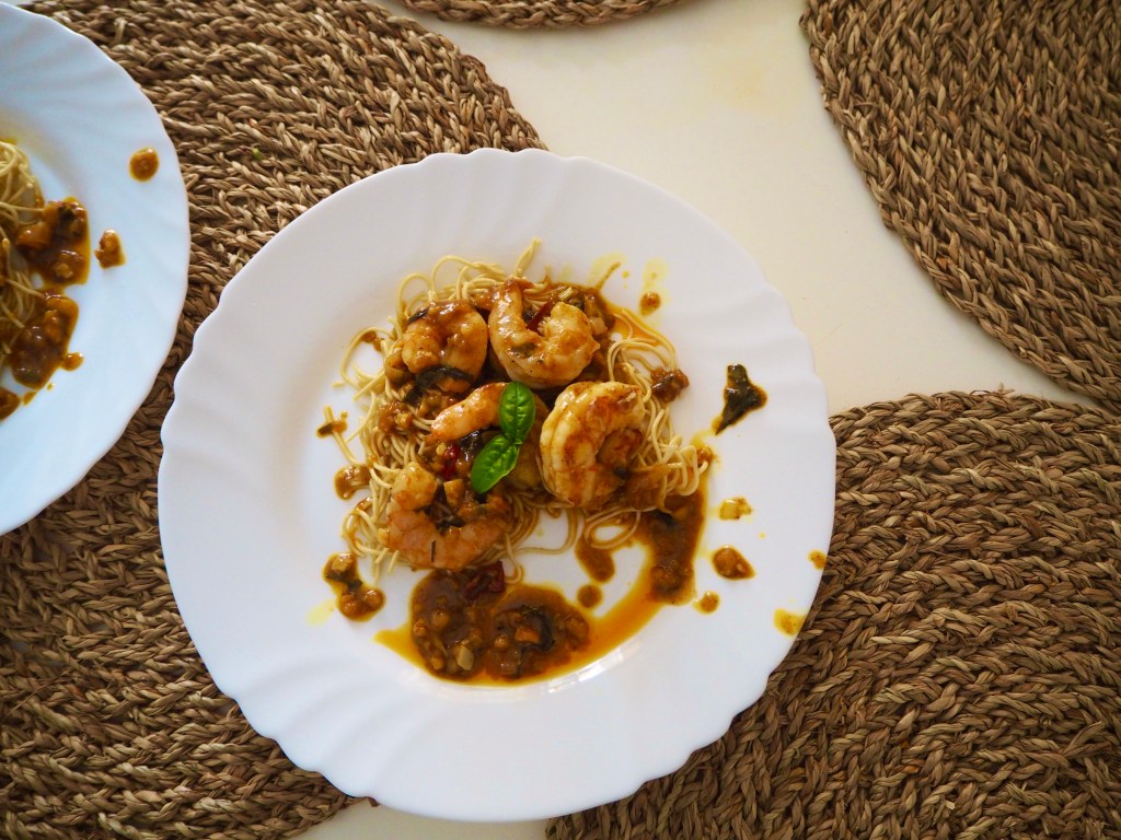 No minkä kanssa ravut tarjolle? Keitin toisella kerralla hyviä nuudeleita ja tuhlasin kastiketta päälle. Niin hyvää. Tämä herkku on varmasti tosi hyvää myös lämpimän kovakuorisen leivän ja/tai riisin kanssa. Ekalla kerralla laitoin kastiketta saaristolaissipsien päälle. No nam! Laita tarjolle myös limen lohkoja, jokainen voi halutessaan tiristää lisää hapokkuutta päälle. Espanjassa kun ollaan, niin kylmän hikoileva valkoviinilasi lautasen viereen. Un vino blanco verdejo.