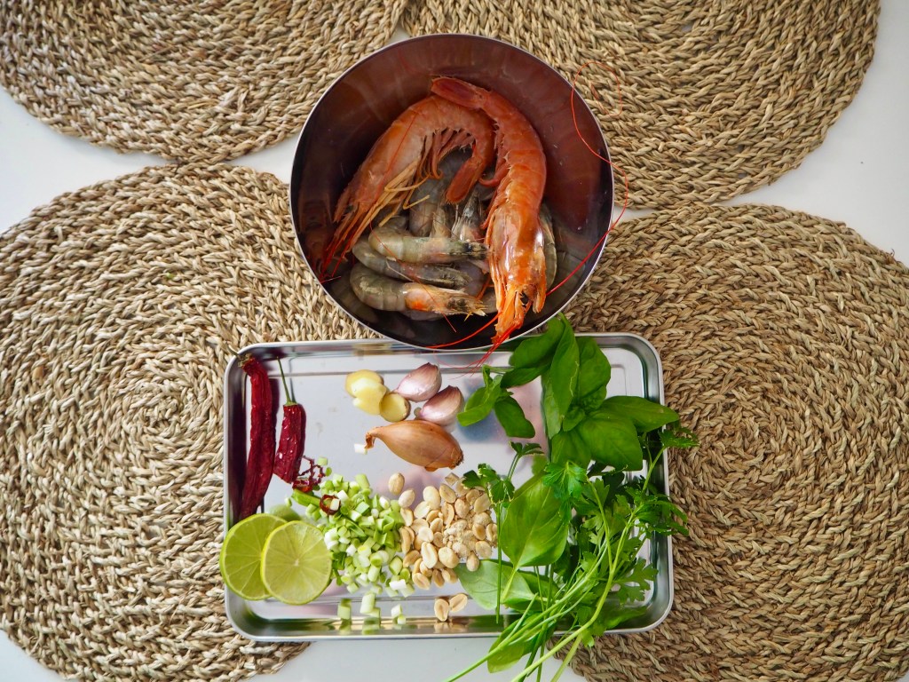 Kuorin ravut ja puhdistin ne, aikamoista askartelua. Olin ennen rapujen käsittelyä valmistellut ja pilkkonut kastikkeen raaka-aineet. Inspiraationa satay-kastike, tässä mun versio. Maustamisasiat on niin monesta jutusta kiinni mm. valkosipulin, chilin, pippureiden vahvuudesta ja ennen kaikkea siitä, minkälaisesta vahvuudesta just sä ja sun bändi tykkäätte.